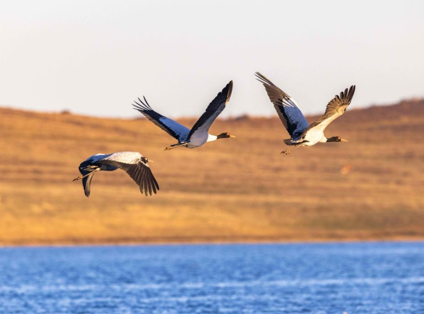 黑颈鹤飞抵云南大山包越冬